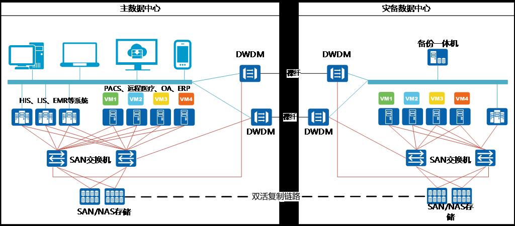 雙數據中心間采用DWDM波分復用設備連接。提供10GE/40GE/8G FC、16G FC接口,連接業務平面、管理平面、存儲雙活平面。實現存儲雙活、應用雙活、云平臺一體化管理。災備數據中心建設一套備份一體機。對數據進行備份。