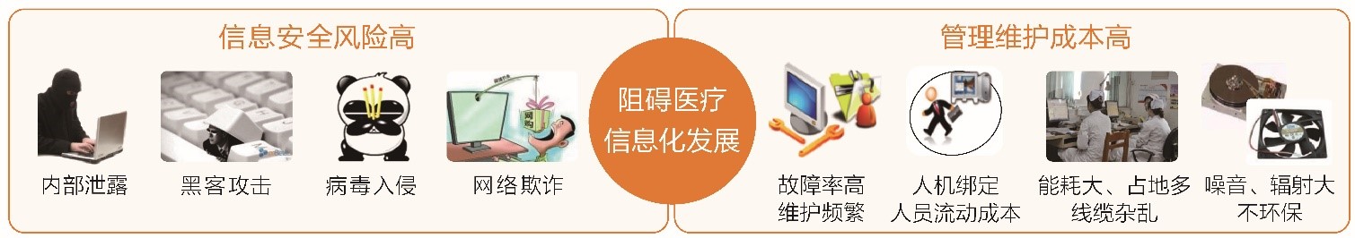 隨著信息化技術的不斷發展,以互聯網醫療、移動醫療為代表的新型醫療服務模式也隨之興起,這使得醫院的信息化系統面臨從分散到集中,從固定到移動,從孤立到協作的變革壓力。而傳統的分散、孤立、固定的PC辦公系統已經不適應醫療信息化的新需求,同時也無法避免數據安全漏洞大、維護成本高、辦公環境雜亂的問題。