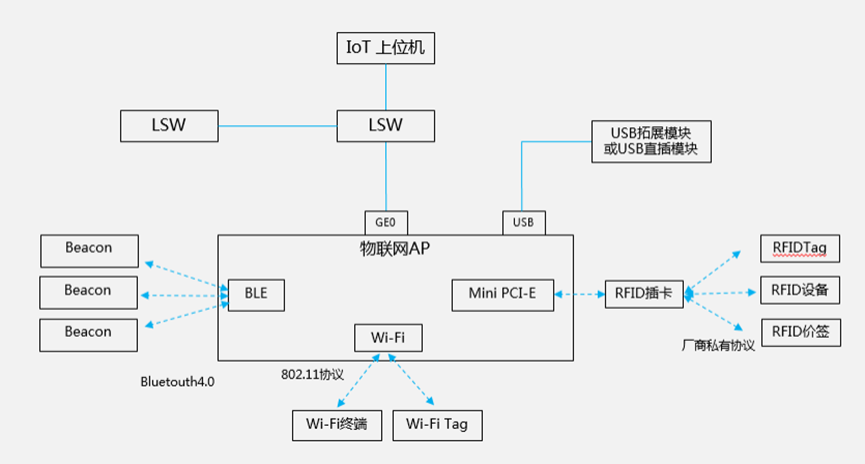 在物聯網AP上保持了原有的 Wi-Fi 模塊,可為Wi-Fi終端用戶提供WI-FI接入服務,同時Wi-Fi模塊也可以為Wi-Fi Tag提供定位服務。同時內置藍牙模塊,可以通過Bluetouth4.0 的協議與Beacon通信,提供藍牙定位服務。另外內部還可提供了標準的Mini-PCI-E擴展槽位,可以插入滿足 Mini-PCI-E 接口標準的物聯網模塊。還提供USB接口,可以插入USB直插模塊,或通過USB延長線插入USB擴展模塊。通過擴展槽或者USB接口接入的各個廠商的物聯網模塊,通過其私有的協議與物聯網終端設備進行通信。對物聯網AP來說,AP不需要處理各個廠商私有的協議,AP 只需要將各個模塊處理后的數據做數據轉發即可。