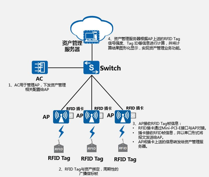 基于RFID技術的資產管理通過RFID Tag 與資產的捆綁,使RFID Tag能唯一標識該資產,RFID Tag周期性發送廣播幀,RFID閱讀器接收廣播幀,并將廣播幀信號強度和Tag 信息上送資產管理服務器,資產管理服務器將定位結果圖形化顯示實現對資產的實時跟蹤和定位,并可以實現資產移動軌跡查看和自動盤點等功能。